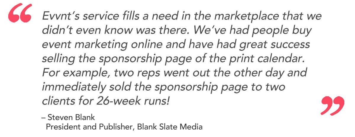 Upgrade your current calendars with an automated online event marketing platform that can also reverse-publish to a print calendar, making the entire process fast, simple and highly profitable! Metro has partnered with Evvnt, Inc. to simplify event calendar creation and management while generating substantial revenue with ticketing, marketing and discovery services