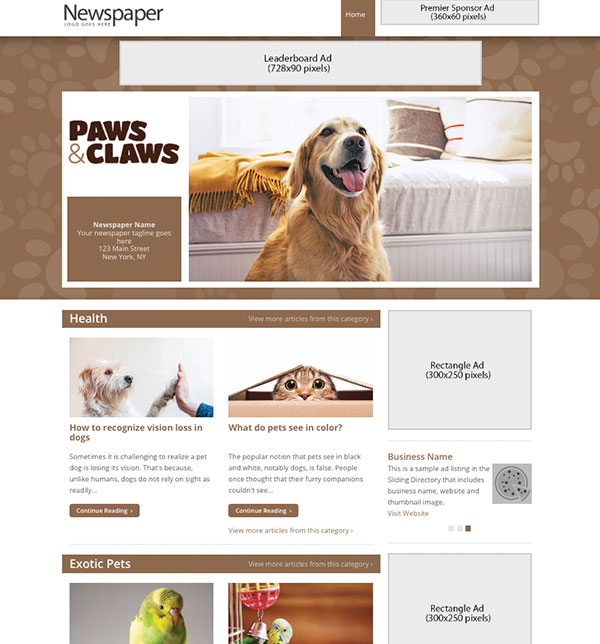 Copyright-free features focused on leash training tips, vision loss in pets, feline diabetes, home and backyard safety, bird care, fish FAQs, exotic pets and more