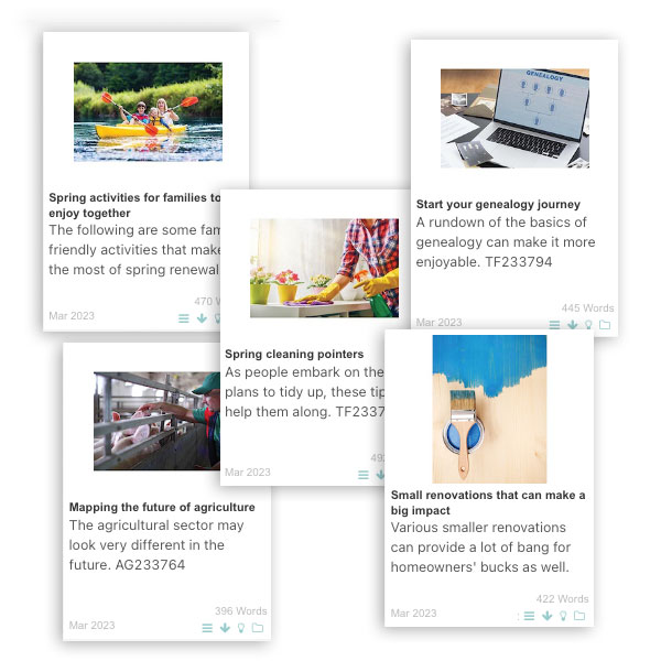 • Over 40 fresh spec ads • Hundreds of new images • Contest ideas and promotions • Top ad sales prospects • Social media posts • Self-promotion ads • “Shop local” coverage • Section covers and pages • Ad starters • Backgrounds • Full-page calendar • Copyright-free articles • Directory layouts • Infographics and shaped ads • Event headings and coverage • Themed graphic elements • Coloring panels • Food photos • Grocery layouts • Religious content • Customer requests • Event promotion ads • Focused content for Canada • Games, puzzles and recipes