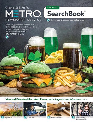 All-New Inspiration to Build Sales & Support Advertisers Help local businesses make the most of every upcoming opportunity using the latest creative content and sales ideas from your March SearchBooks®. Clickable pages connect you directly to every timely promotion, image and layout for instant downloading, making it easier than ever to view, plan, organize and monetize your month.