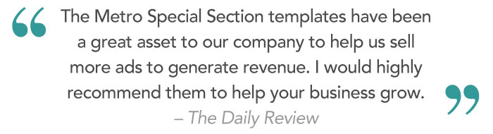 Amp up ad sales revenue while minimizing production time with fully written and designed, presentation-ready special sections with ready-to-sell ad spots in place!