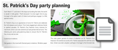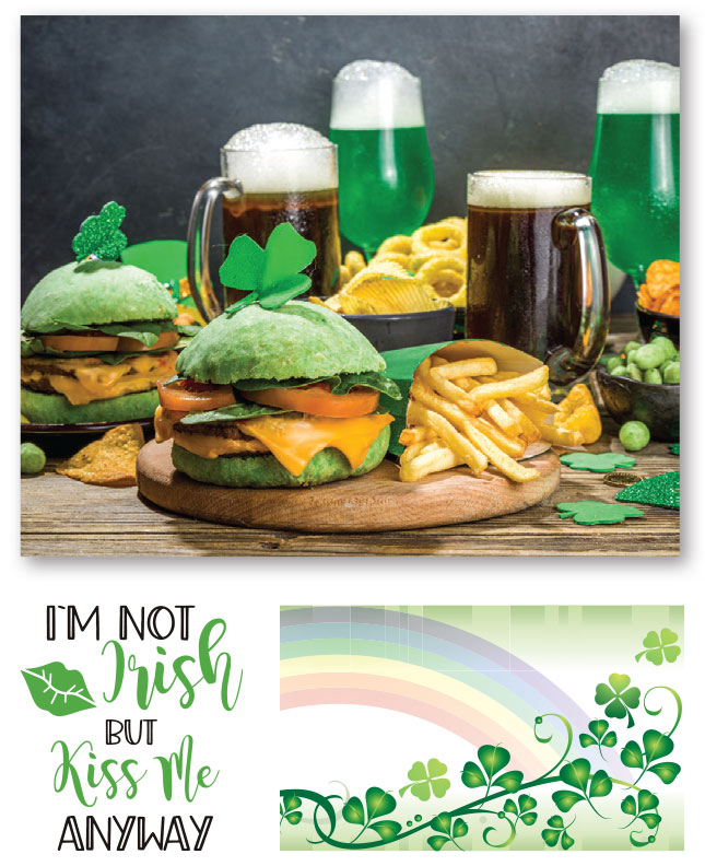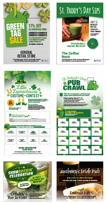 Pub crawl page, restaurant and retail spec ads, eye-catching infographic, festive images, articles, recipes, directories, headings, cover designs, social posts, contest ideas, parade promotions and moreā¦