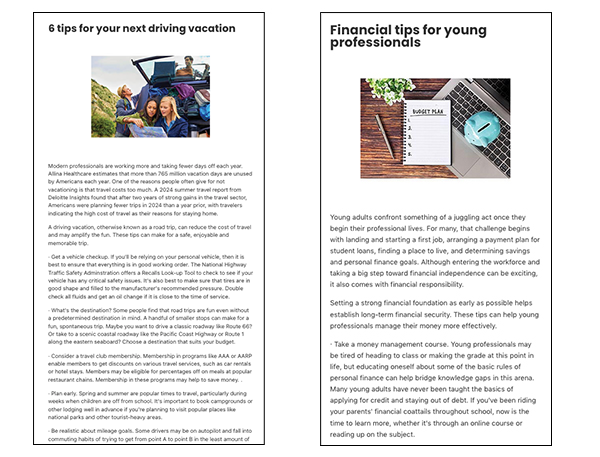 EDITORIAL FEATURES Entice online advertisers with unlimited, unbranded, copyright-free articles that tie in with their business or seasonal promotions. Use the ready-to-post teaser text at the end of each story to drive traffic via your social feeds.