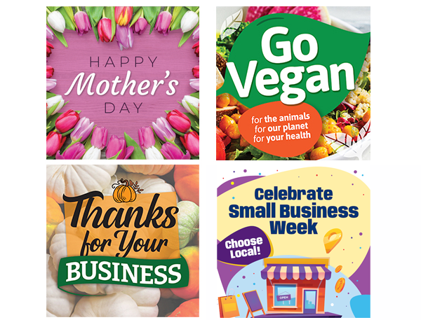 SOCIAL POSTS Enhance your digital marketing strategy instantly with ready-to-post JPGs for your Facebook and Instagram accounts. Find designs to engage local businesses and drive traffic to your website around monthly events, holidays and seasonal promotions.