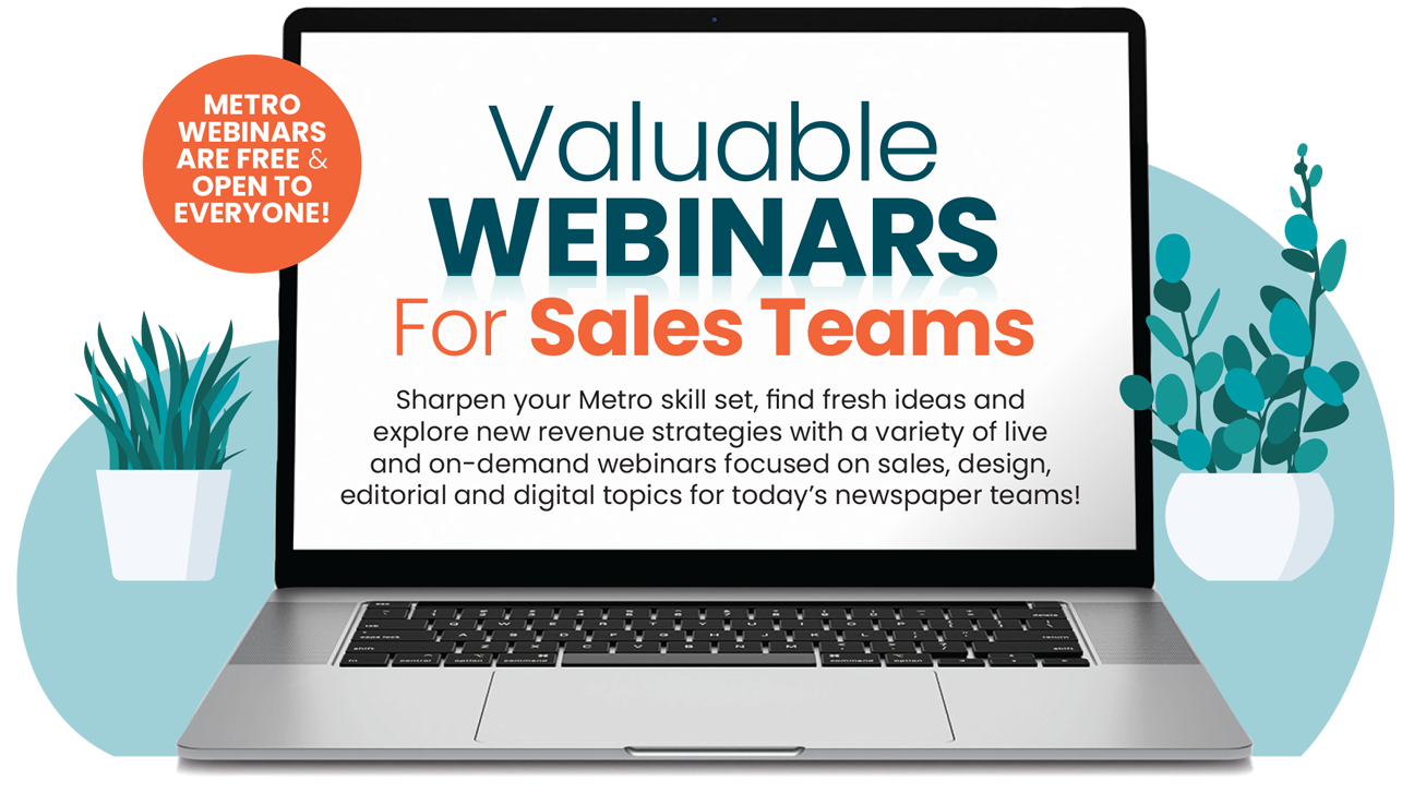 Join us in exploring the various ways local newspapers and publications are teaming up to create more productive collaborative cultures, and how your Metro subscription tools can help. This live webinar will present industry-tested best practices for getting sales and creative pros working together to save time, increase efficiency and produce greater revenue, all while improving customer and workplace satisfaction. We’ll also review how one publication used their team-focused approach to successfully plan and sell a popular program idea worth $5,000 in monthly revenue.